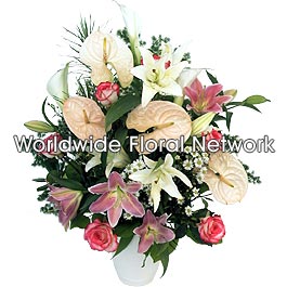 Stunning arrangement in pink and white colors. Featuring lilies, roses, anthuriums and asters. Sure to be a hit!