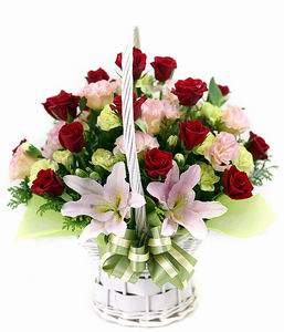 手提紅玫瑰花籃。以12朵紅玫瑰,搭配粉色桔梗、百合陪襯。Basket arrangement of 12 stems of red roses witn pink flowers. 適合生日、祝賀、昇官場合。