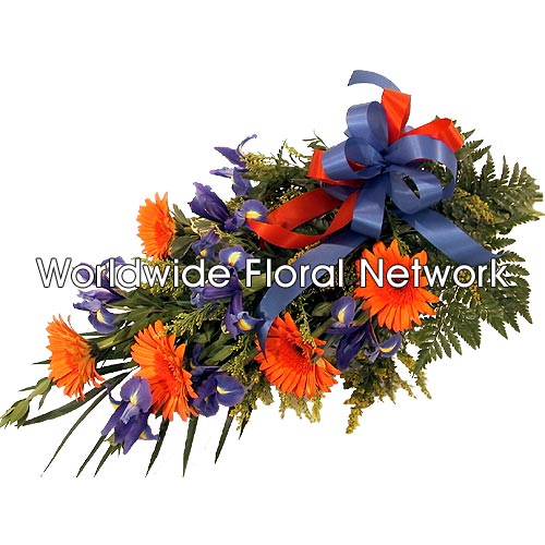 Organge and blue flowers look amazing together! This bouquet features gerbera daisies and blue irises in a striking combination, with matching bow.
