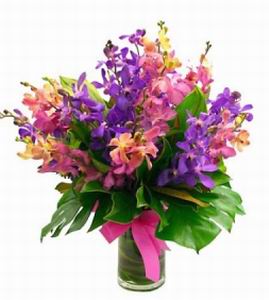 tropical vase arrangement of long lasting Vanda orchids and tropical