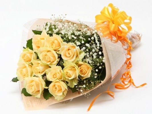 敘述:精心設計的玫瑰花束,12朵黃玫瑰(yellow)花束,搭配襯草。(襯花襯草與包裝紙,各地隨機現貨搭配,請提早2-3天訂購).(花束長度約48公分)。